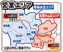 青梅・羽村・福生・瑞穂・あきる野・日の出・奥多摩・武蔵村山・昭島・立川・東大和・東村山・小平・飯能・入間・所沢 ※その他近隣エリアの方もお気軽にお問い合わせください。
