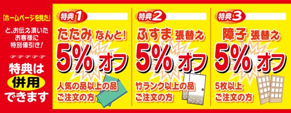 1.見積もり無料(まずはお電話ください)、2.豊富な品揃え(見本帳もご用意)、3.即日仕上げOK(朝引き取り・夕方納品)、4.家具の移動無料、5.畳のスキ間無料補修、6.寸法ピッタリ7.畳を上げたあとの床のお掃除無料、8.畳の拭き掃除無料、9.土・日の工事も対応、10.シミを作っても半年以内1枚無料交換